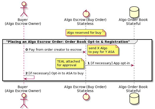 Buy orders have a similar mechanism. An Algorand Smart Contract is created when a user wants to buy an ASA for ALGOs. The smart contract then debits the correct amount of ALGOs from the user's wallet and holds it in escrow. The buy order contracts contain an inequality to accept any price below the price limit.